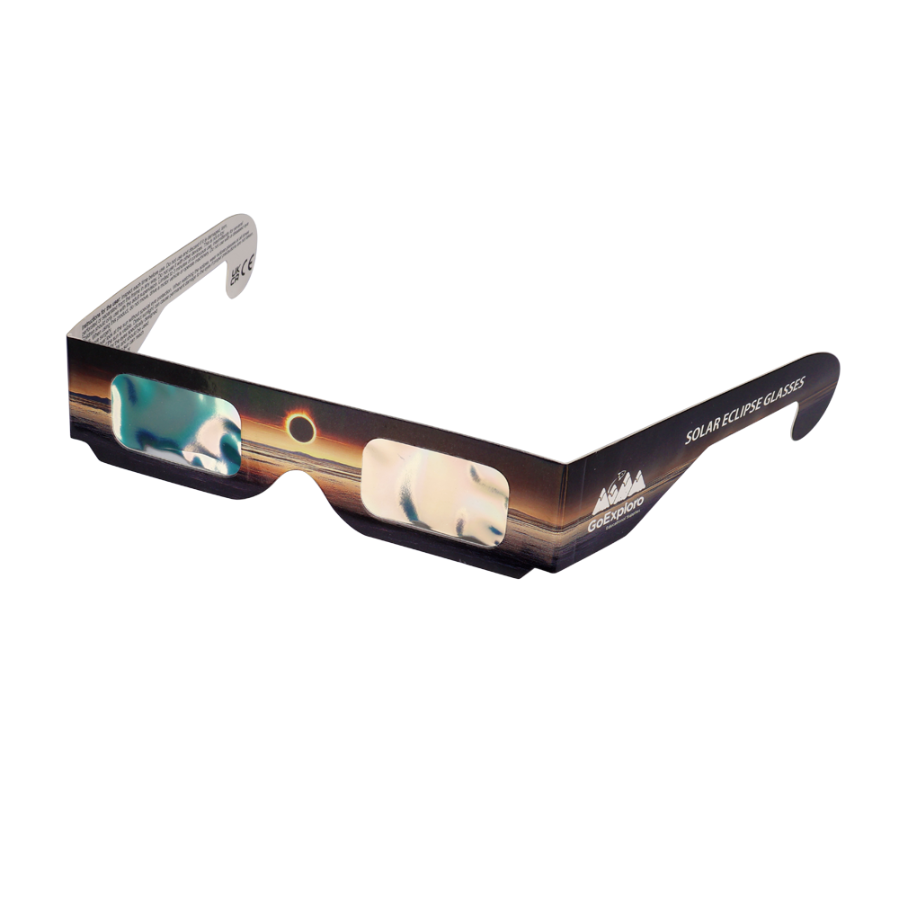 This single pair of eclipse glasses allows safe direct viewing of the Sun during solar eclipses and other solar observations. The solar viewing film blocks harmful ultraviolet, visible, and infrared radiation, letting users observe the Sun as a comfortable orange image.